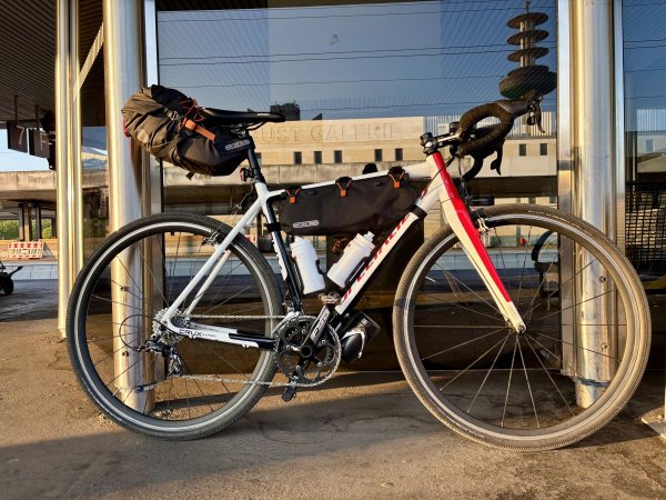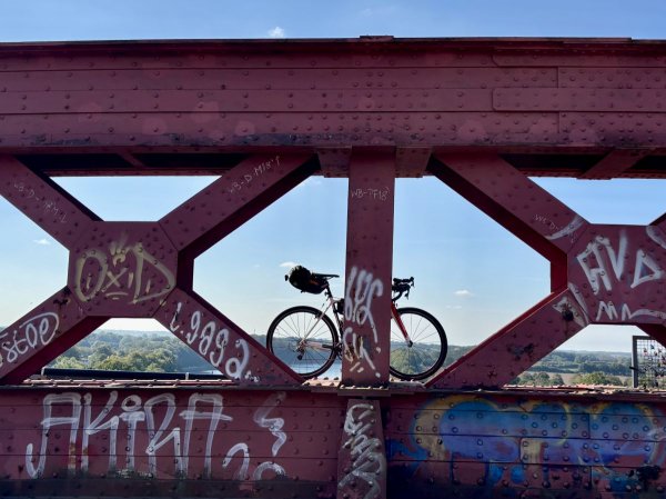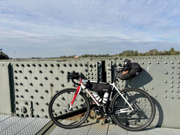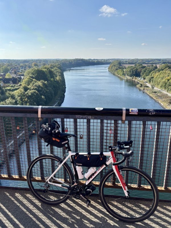 Nach meinen Erfahrungen auf der Nachtfahrt nach Frankfurt hatte ich mein Setup für diese Tour erneut etwas angepasst. Die Flaschenhalter im Rahmendreieck habe ich gegen Modelle ausgetauscht, bei denen sich die Flaschen seitlich entnehmen lassen. Zudem bin ich auf leichte 550-ml-Flaschen von Elite umgestiegen. So funktionierte die Kombination aus Flaschen und Oberrohrtasche trotz meines recht kleinen Rahmens problemlos.