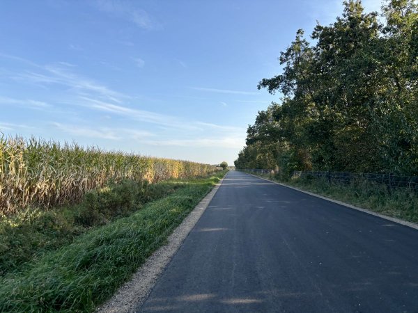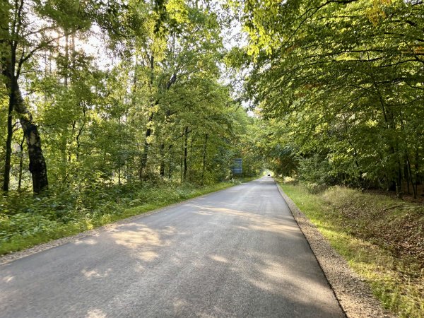 Ab jetzt fuhr ich auf absolut einsamen und perfekt asphaltierten Straßen in Richtung Westen. Die Sonne stand inzwischen schon recht tief am Himmel. Zuerst ging es durch bewaldetes Gebiet; dann folgte eine Landschaft, die mich an die Lüneburger Heide erinnerte. Schließlich ging es schnurgerade durch landwirtschaftliche Felder und Wiesen mit Kühen und Schafen. Bis auf die Tiere – und wenige Trecker – war ich hier komplett allein.