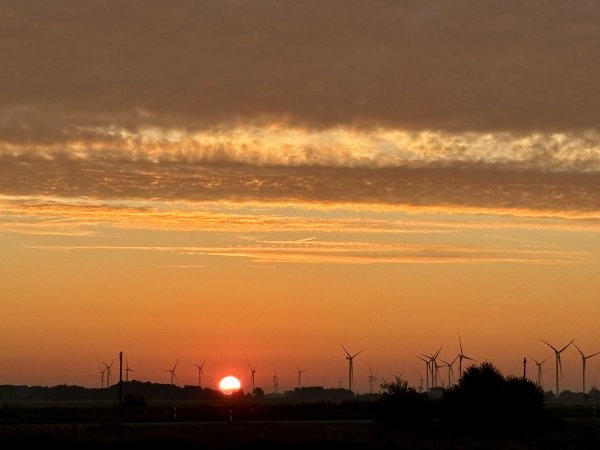 Kurz nach dem Start ging im Osten die Sonne über dem flachen Land auf – ein grandioser Anblick. Für mich ging es erstmal weiter Richtung Nordsee, zum nördlichsten Festlandpunkt Deutschlands, dem Rickelsbüller Koog.